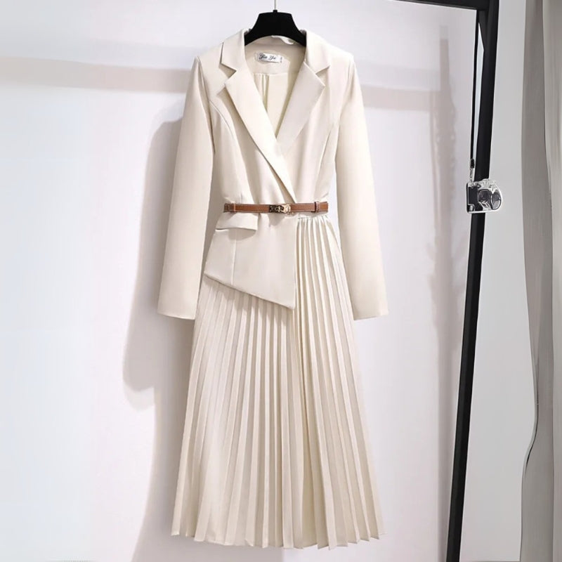 Damenkleid mit Reverskragen und Gürtel sowie plissiertem Rockteil