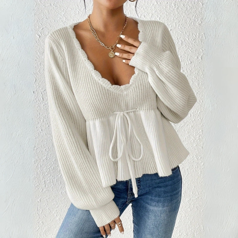 Damenpullover mit V-Ausschnitt und Bindeband an der Taille