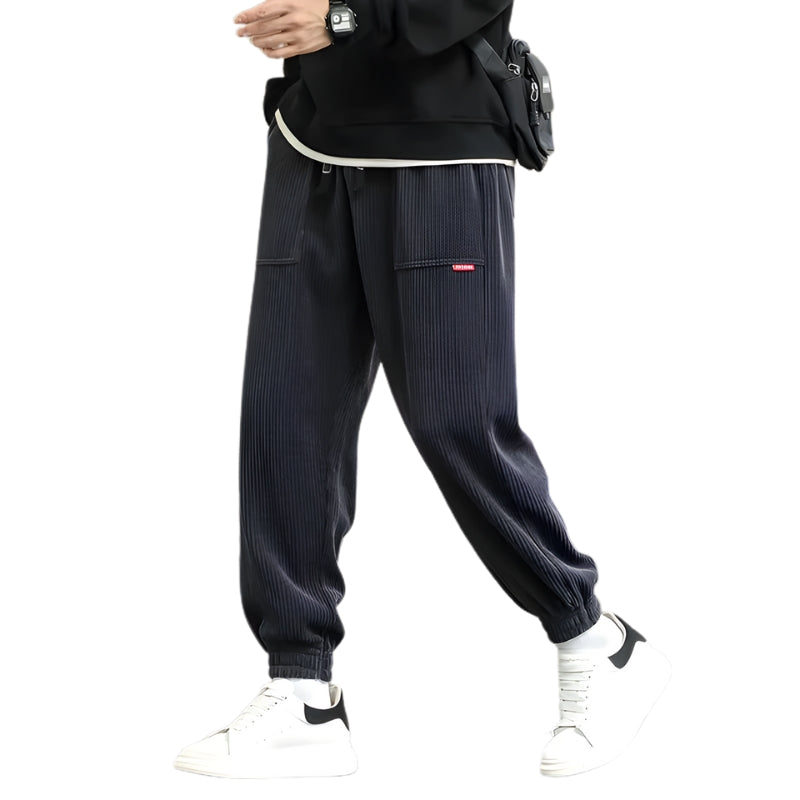 Diese Jogginghose hat einen modernen Streetwear-Schnitt mit gerippter Struktur und leicht konisch zulaufenden Beinen. Der verstellbare Kordelzugbund sorgt für eine raffinierte Passform, die ein Gleichgewicht zwischen Struktur und Bewegungsfreiheit schafft.